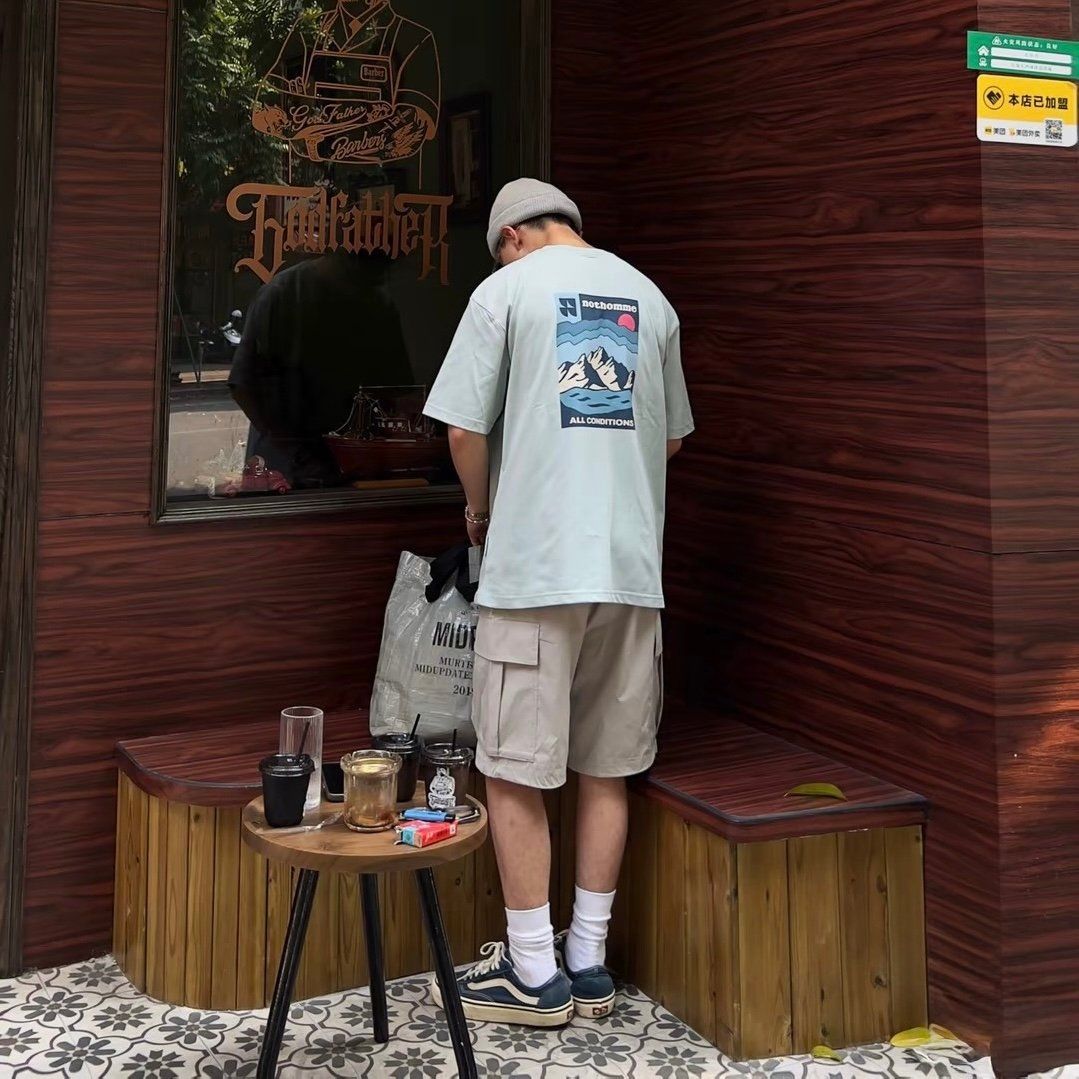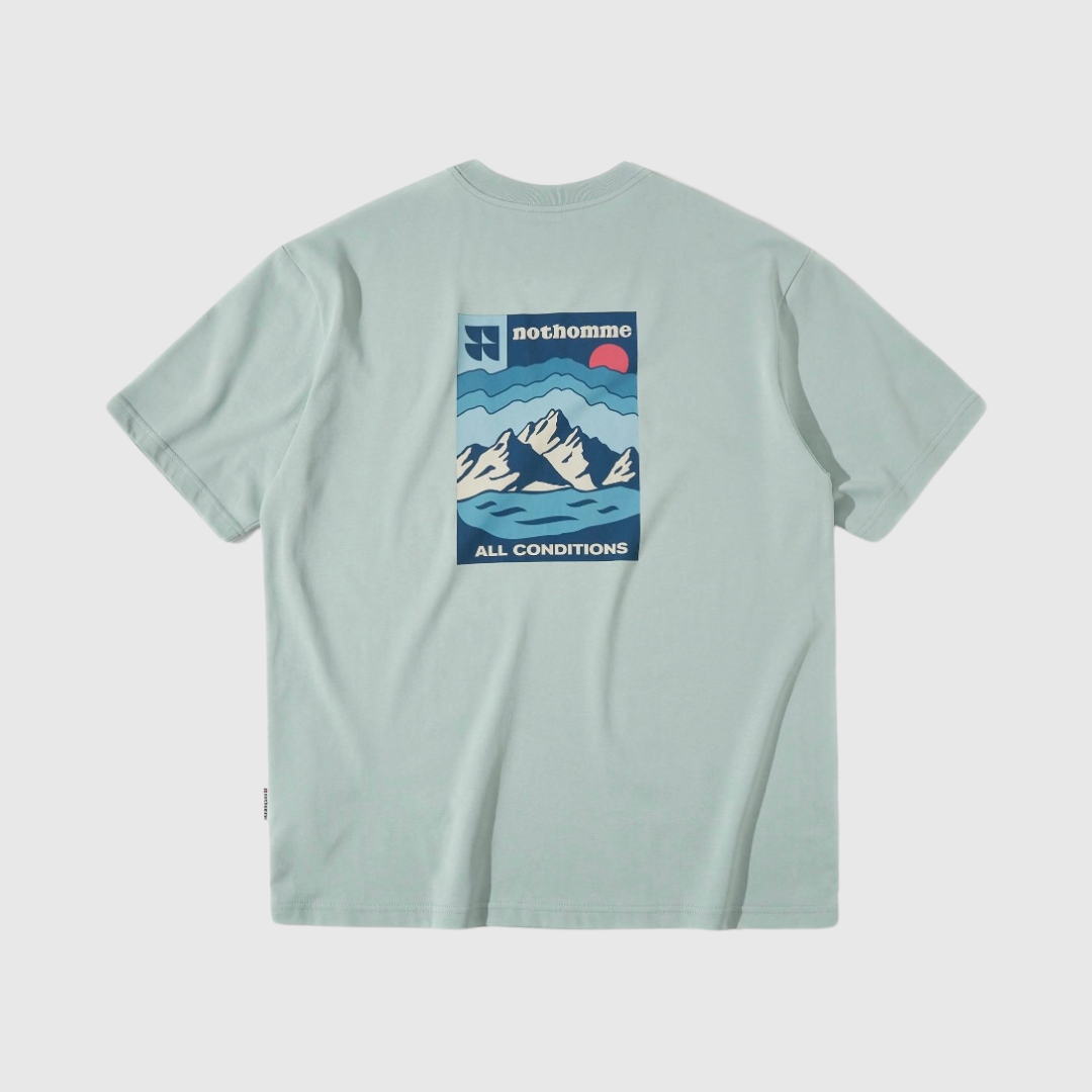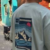 Mặt sau áo nổi bật với họa tiết in phong cảnh núi – biển – trời kết hợp logo Nothomme, tạo điểm nhấn trẻ trung và năng động. Dáng áo rộng rãi, cổ tròn cơ bản, dễ phối với nhiều phong cách từ streetwear, sporty đến casual.
