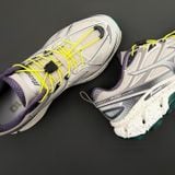 Thân giày là tông xám be (dove grey) nhẹ nhàng, tạo nền trung tính dễ mặc. Dây giày màu vàng chanh nổi bật, đóng vai trò điểm nhấn thị giác rõ ràng, giúp tổng thể không bị trầm. Bên trong lót tím nhạt mang lại sự chuyển màu thú vị khi nhìn cận cảnh, còn phần đế ngoài xanh cổ vịt tạo chiều sâu và cá tính cho toàn bộ thiết kế.
