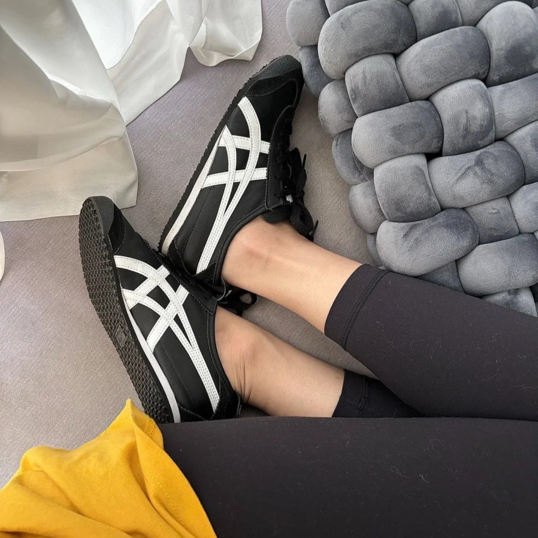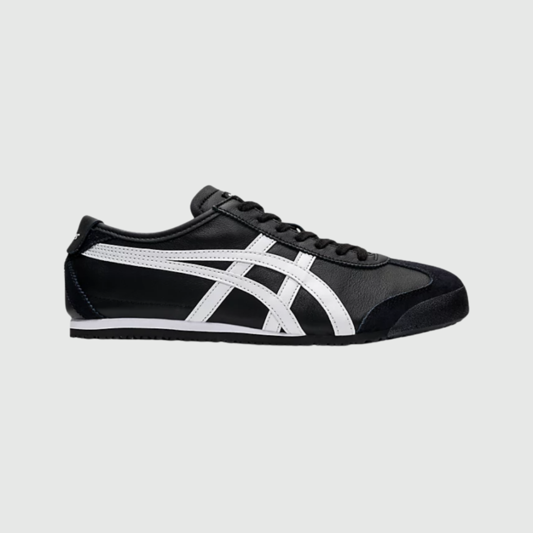 Phiên bản Black / White sử dụng tông đen làm màu chủ đạo cho phần upper, kết hợp với các sọc Tiger Stripes màu trắng nổi bật ở hai bên thân giày. Sự tương phản giữa hai gam màu cơ bản tạo nên tổng thể mạnh mẽ, tối giản nhưng vẫn giữ được nét thể thao đặc trưng của dòng Mexico 66.