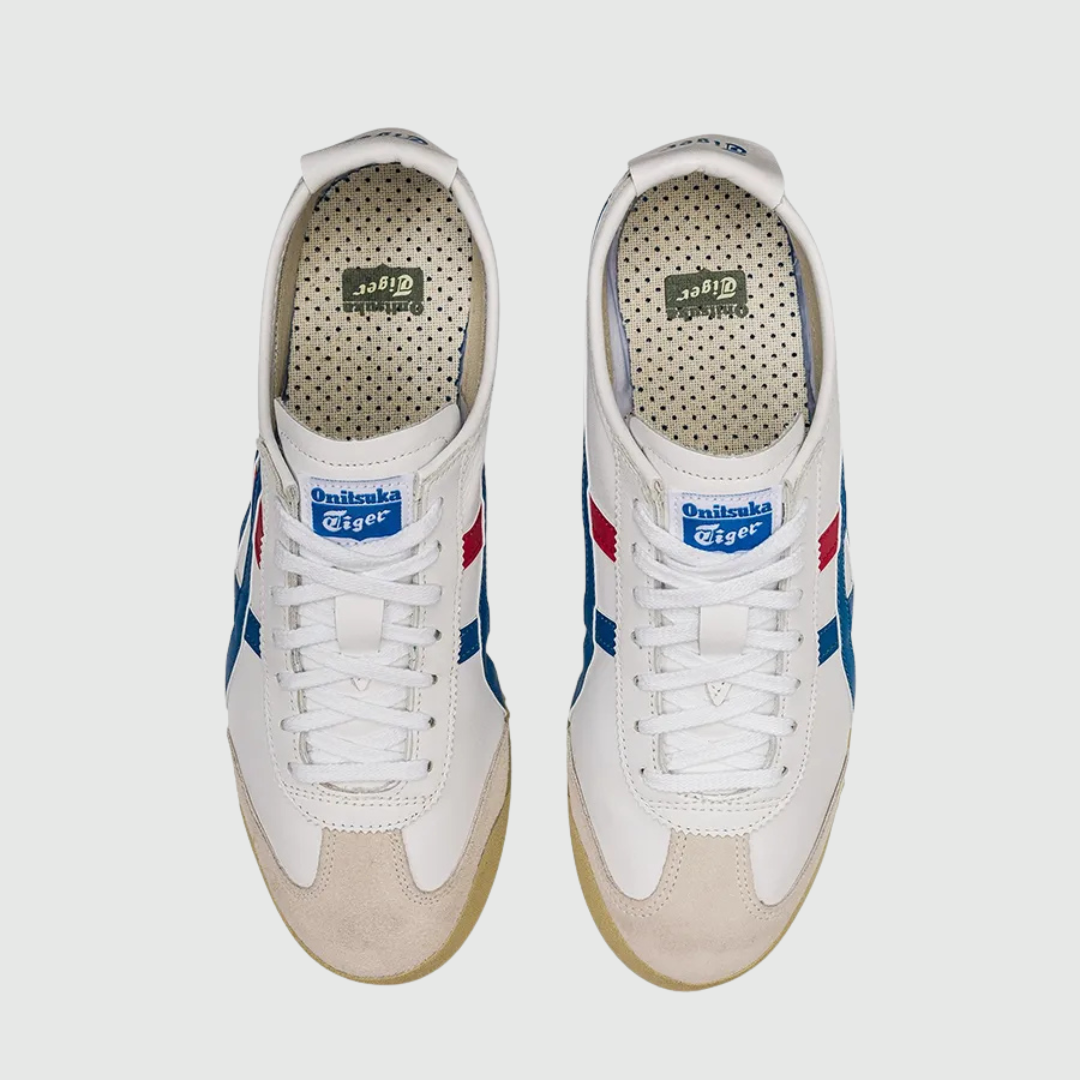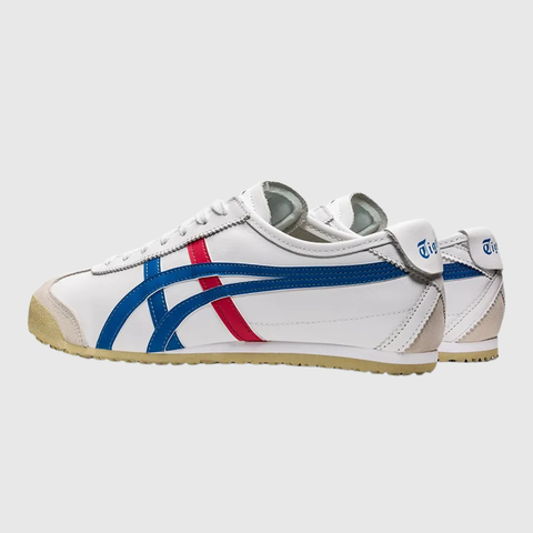 Phiên bản White / Blue sử dụng nền trắng chủ đạo kết hợp với các sọc Tiger Stripes màu xanh nổi bật ở hai bên thân giày. Sự tương phản giữa hai tông màu mang lại tổng thể vừa sạch sẽ, thể thao vừa giữ được nét cổ điển đặc trưng của dòng Mexico 66.