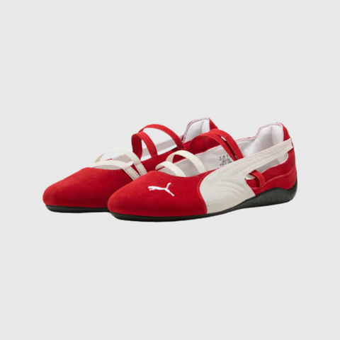 Puma Speedcat Ballet "Red" mang tinh thần motorsport đặc trưng của dòng Speedcat nhưng được làm mềm lại bằng form ballet flat thanh lịch. Tông đỏ nổi bật tạo cảm giác cá tính, thời trang và đầy năng lượng, giúp đôi giày trở thành điểm nhấn mạnh mẽ cho outfit hằng ngày. Thiết kế mũi thon, đế mỏng và form gọn giúp đôi giày vừa nữ tính vừa khác biệt so với sneaker truyền thống.